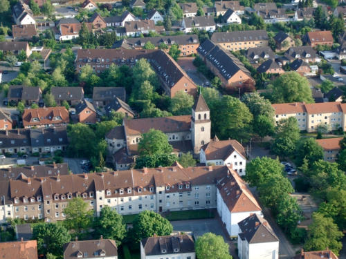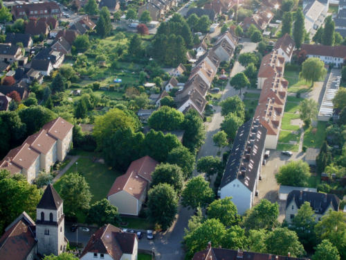 Blick nach Westen - vorn die Herz-Jesu-Kirche - inks Kleines Nordfeld - im