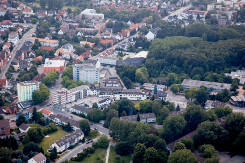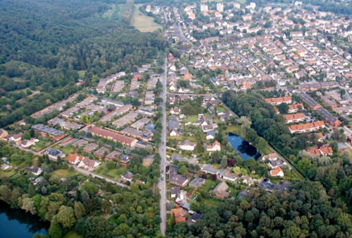 Blick von Norden auf die Buchholzer Straße - links untern das DRK-Depot