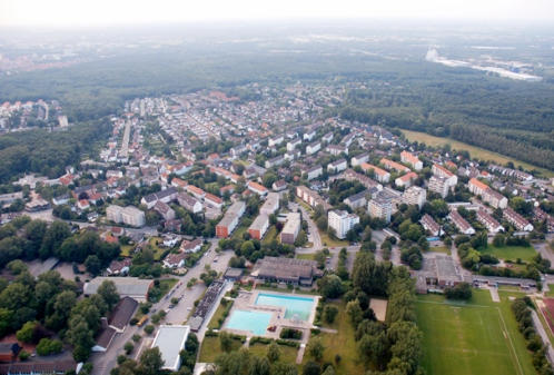 Das Wohngebiet rechts und links der Waldstraße vom Sportpark gesehen -
