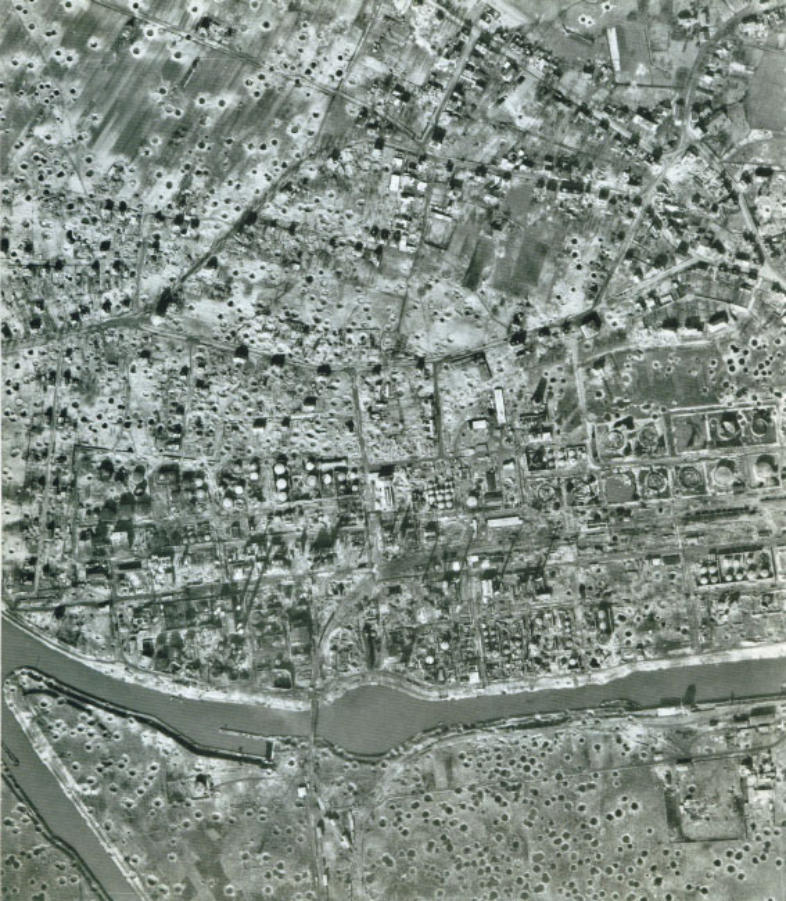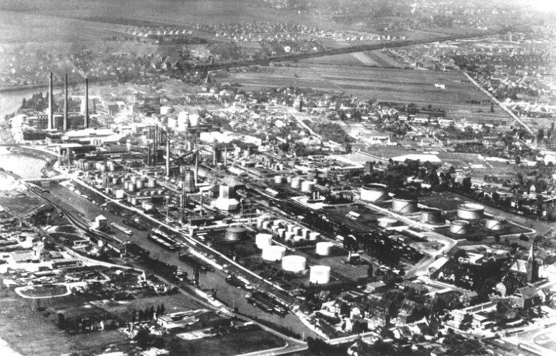 oberhalb des Hafens die zerstörten Anlagen der Erdölraffinerie Deurag-Nerag